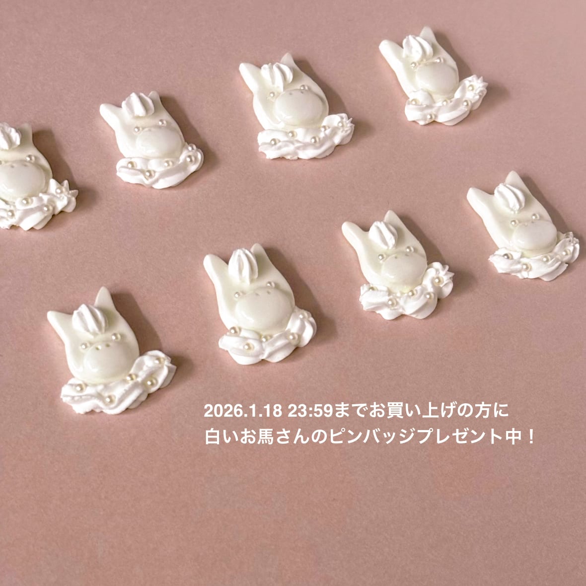 【白いお馬さんのピンバッジプレゼント中】